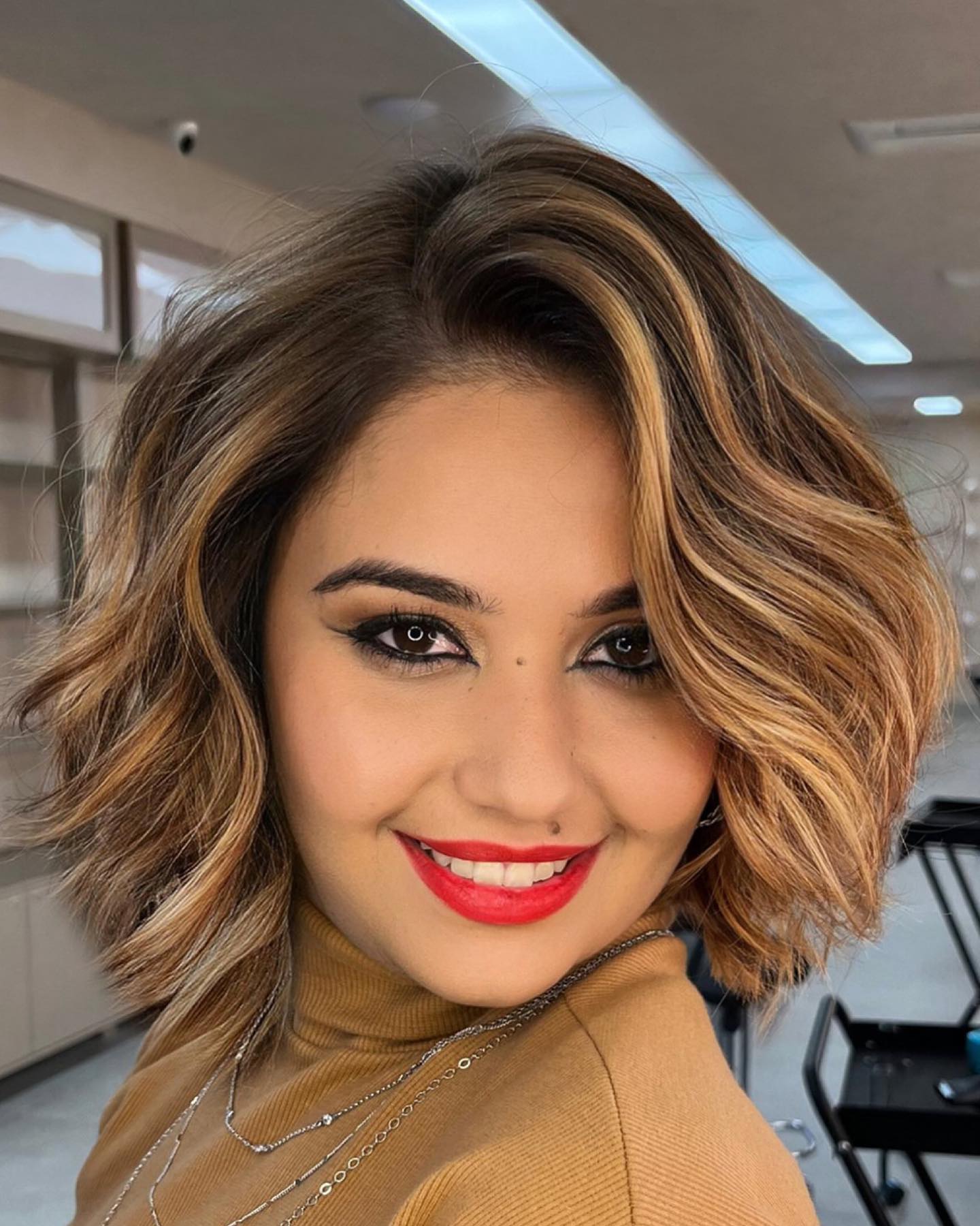If you want a hairstyle that works well with your features, an off-center choppy lob could be perfect. Messy waves that graze the cheekbones and the dark brown roots with a blonde-toned balayage are super-casual and youthful.