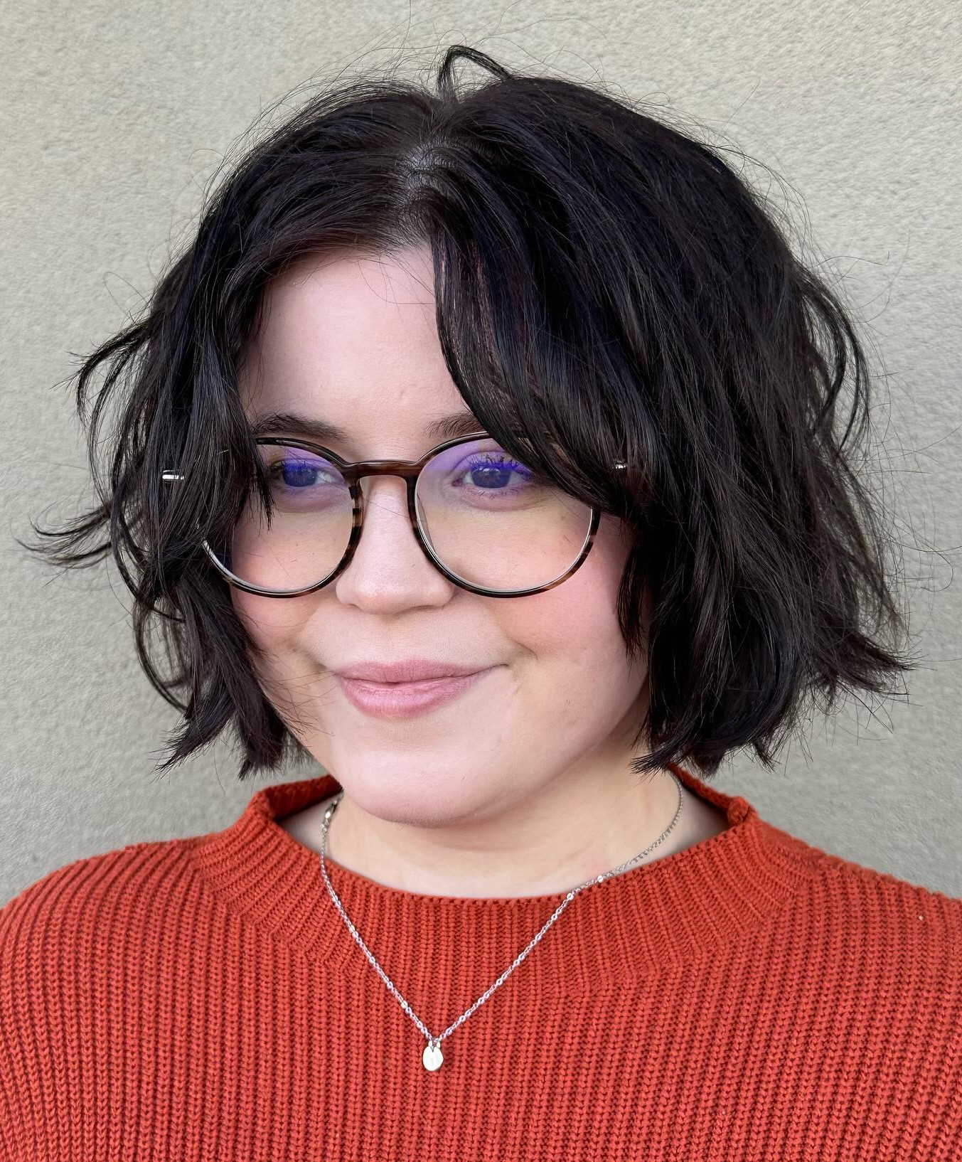 A textured layered bob is ideal for round faces because it adds movement, breaking up the face’s roundness. The layers create angles, making the face appear longer and slimmer. By adding volume at the crown and keeping the ends light, this style ensures an elongating effect.