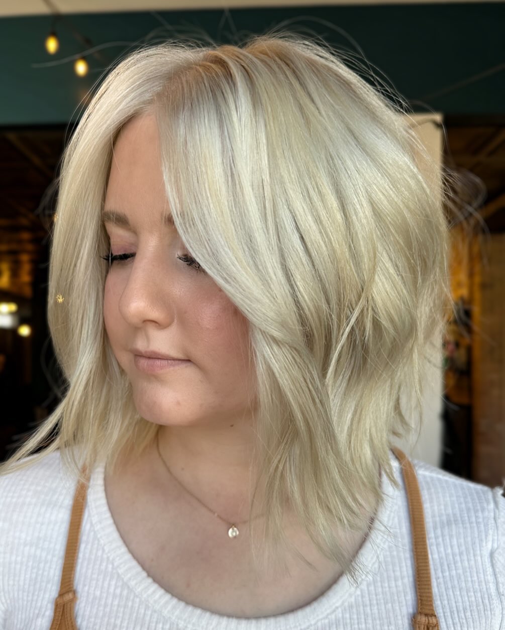 A long, softly beveled bob creates a sleek, elongated silhouette. The gentle layers add movement and the length helps balance proportions beautifully. Plus, it’s a versatile style that’s easy to dress up or keep casual.