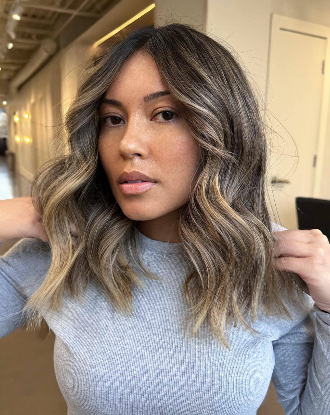 Long layers are a mid-length cut’s best friend, especially if you’re in the process of growing out hair and want it to look as long as possible. Highlights enhance this style with definition and dimension.