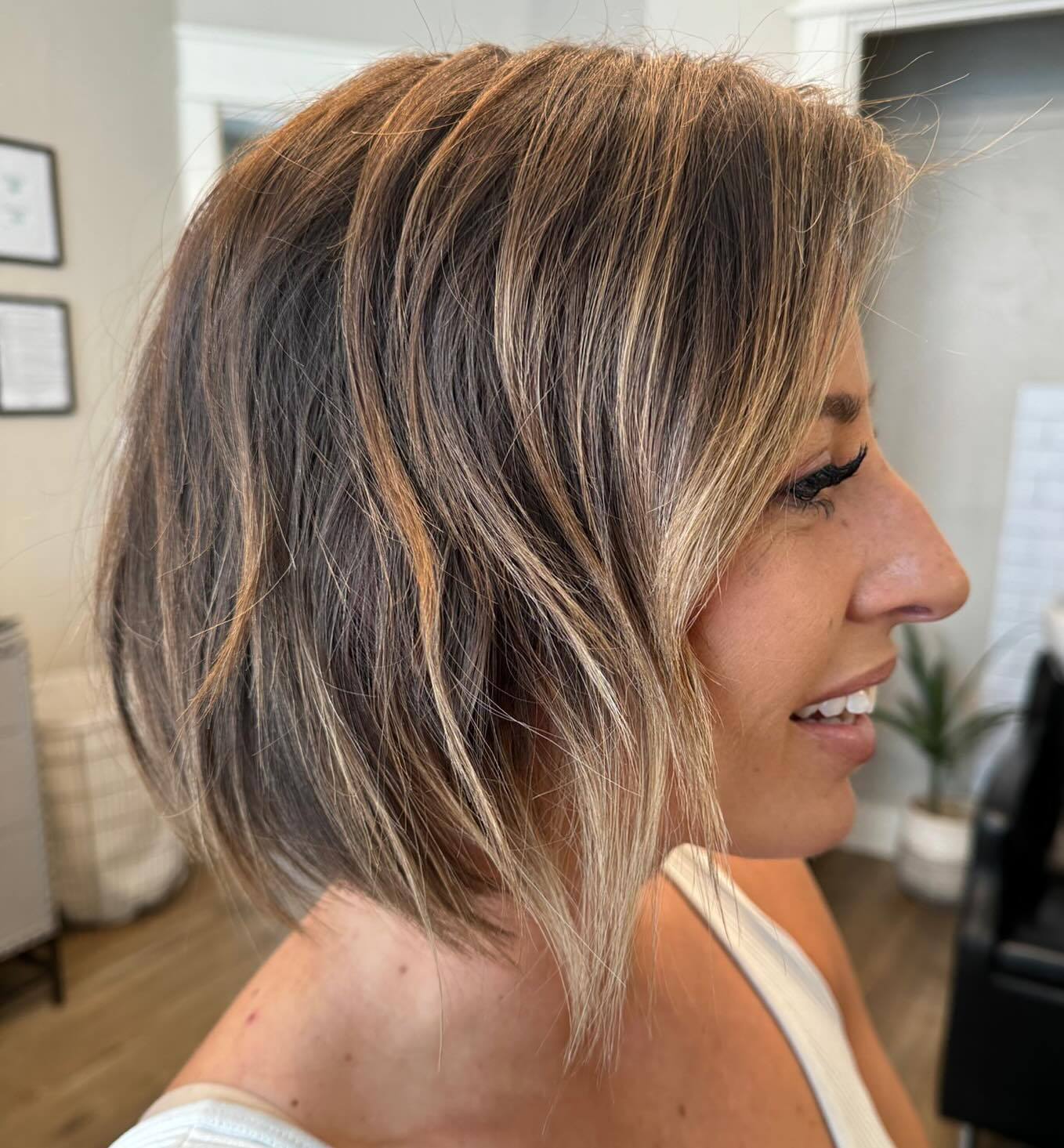 When in doubt, add texture. It brings any cut to life, especially when it comes to bobs. A warm balayage makes this cut very on-trend, and the sleek lines keep it polished and sophisticated. That makes it ideal for any woman, whether you’re in the office running errands or attending any special event.