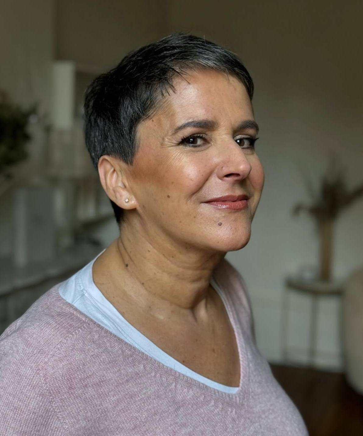 As we age, our hair texture changes, especially if you have gone gray. Cutting your hair into a pixie is a great way to deal with different textures. Make sure you take some length out where you seem to struggle with texture and leave the top section a bit longer to create body and softness throughout the style.
