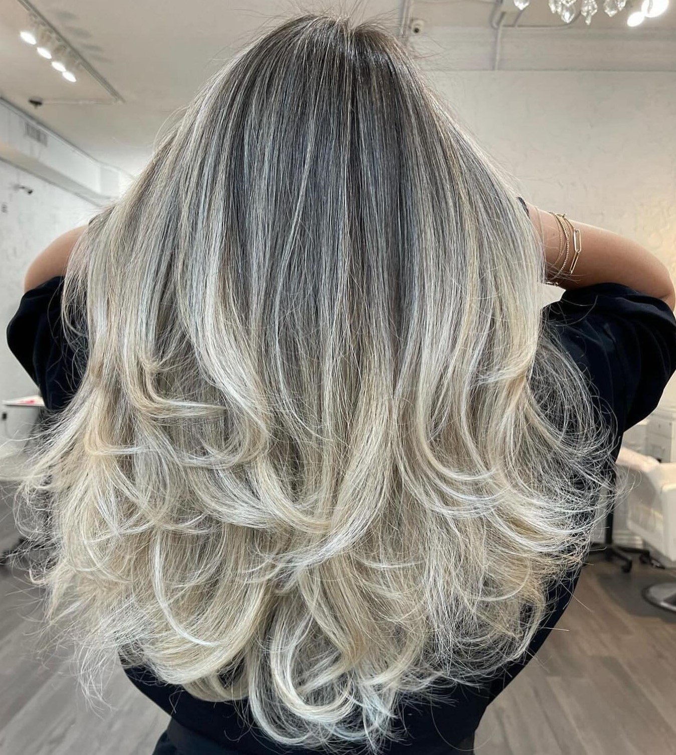 The layers of this chest-length haircut seem so effortless thanks to the white blonde balayage and shadow roots that make the hair look sleek, smooth, and dimensional. You can show off the spectacular color by wearing black clothes; the contrast will make your hair pop.