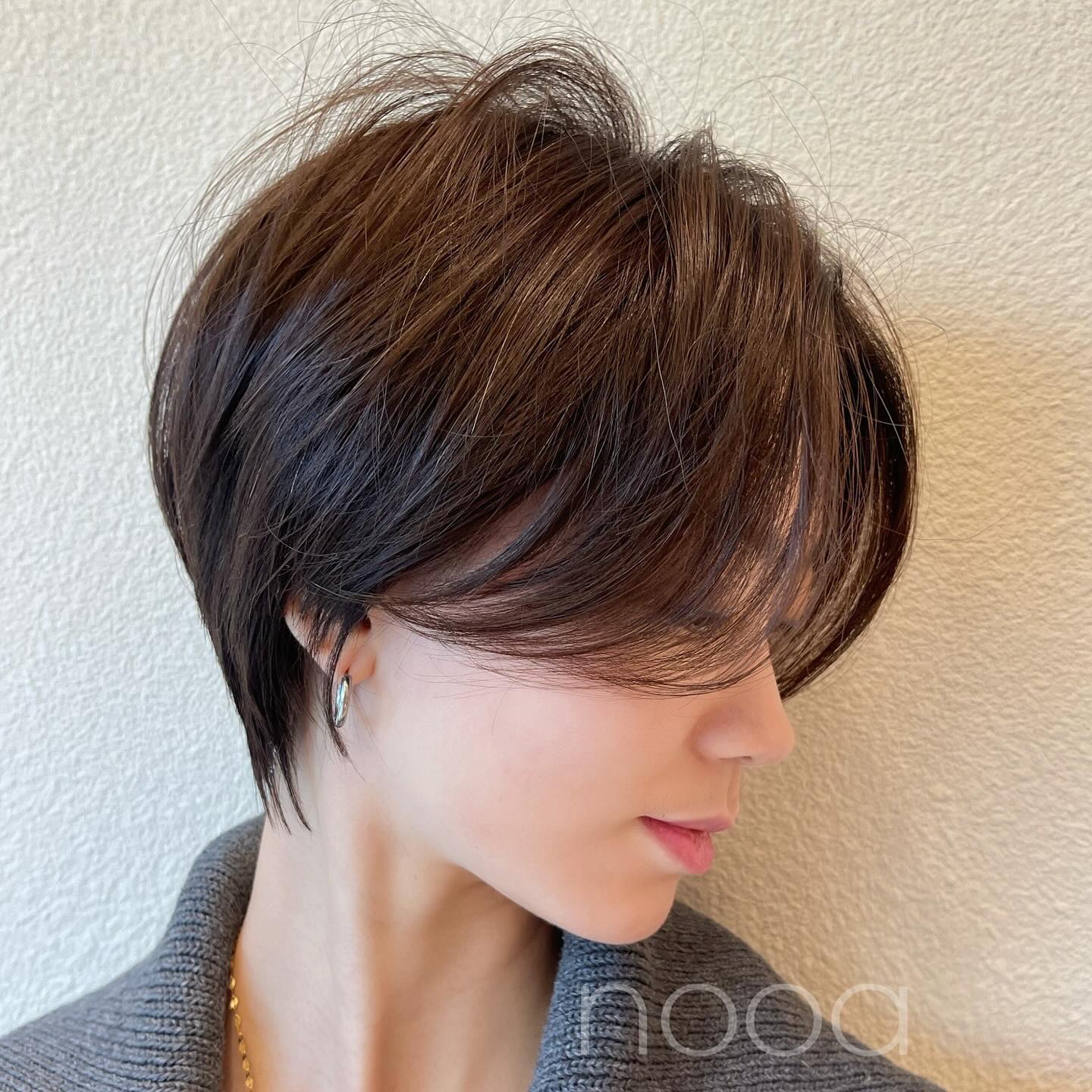 Dark brown hair seems healthier and shinier when styled tousled. The nape area is trimmed close, but not too short. Long side pieces and feathery bangs enhance the angles of the face. Give the top layers a quick tousle to create additional fullness towards the center/rear crown section.