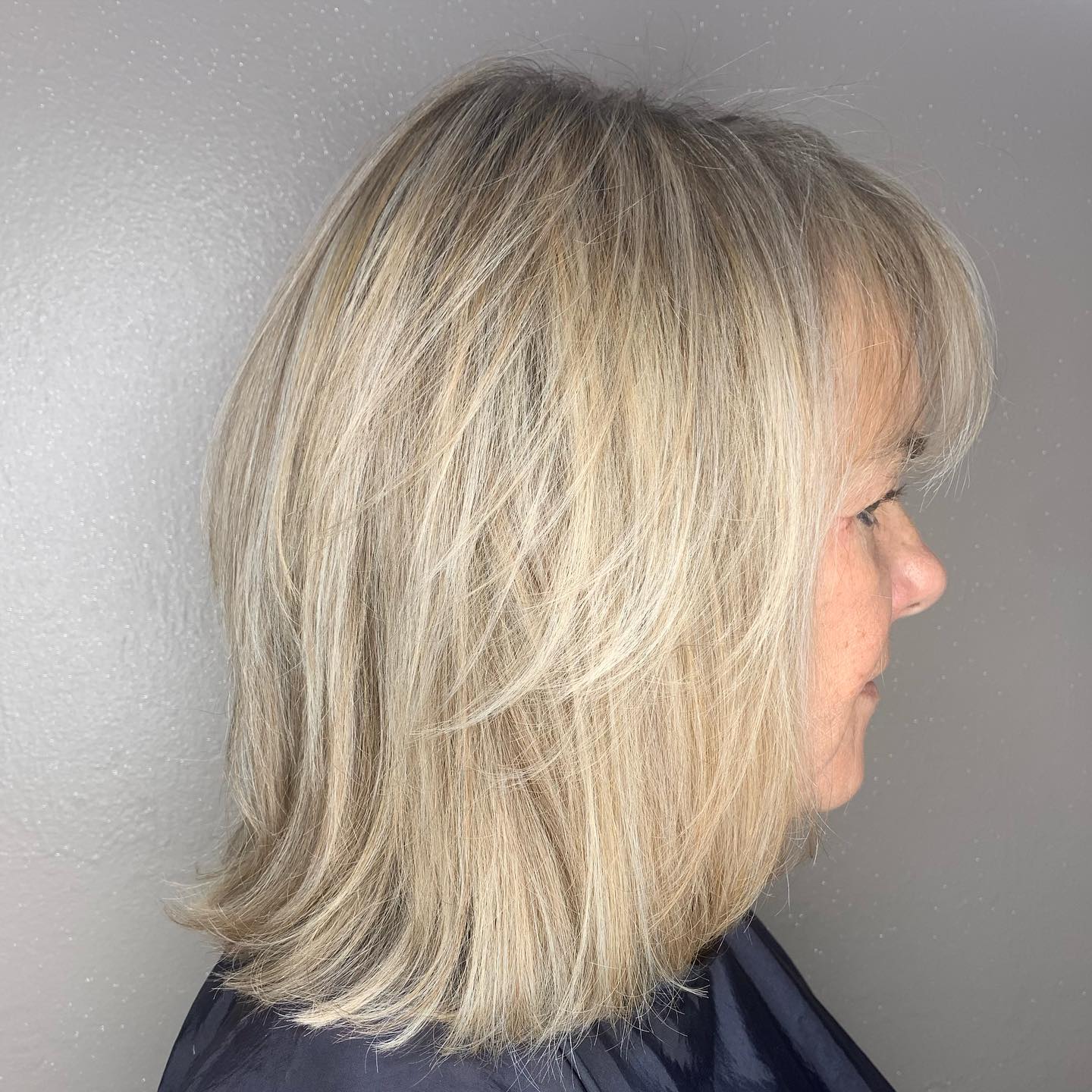 A vibrant shade of blonde knows no age. Style your layered bob with tousled, loose waves complemented by lovely golden blonde highlights. The color and styling look very natural and are great for everyday wear.