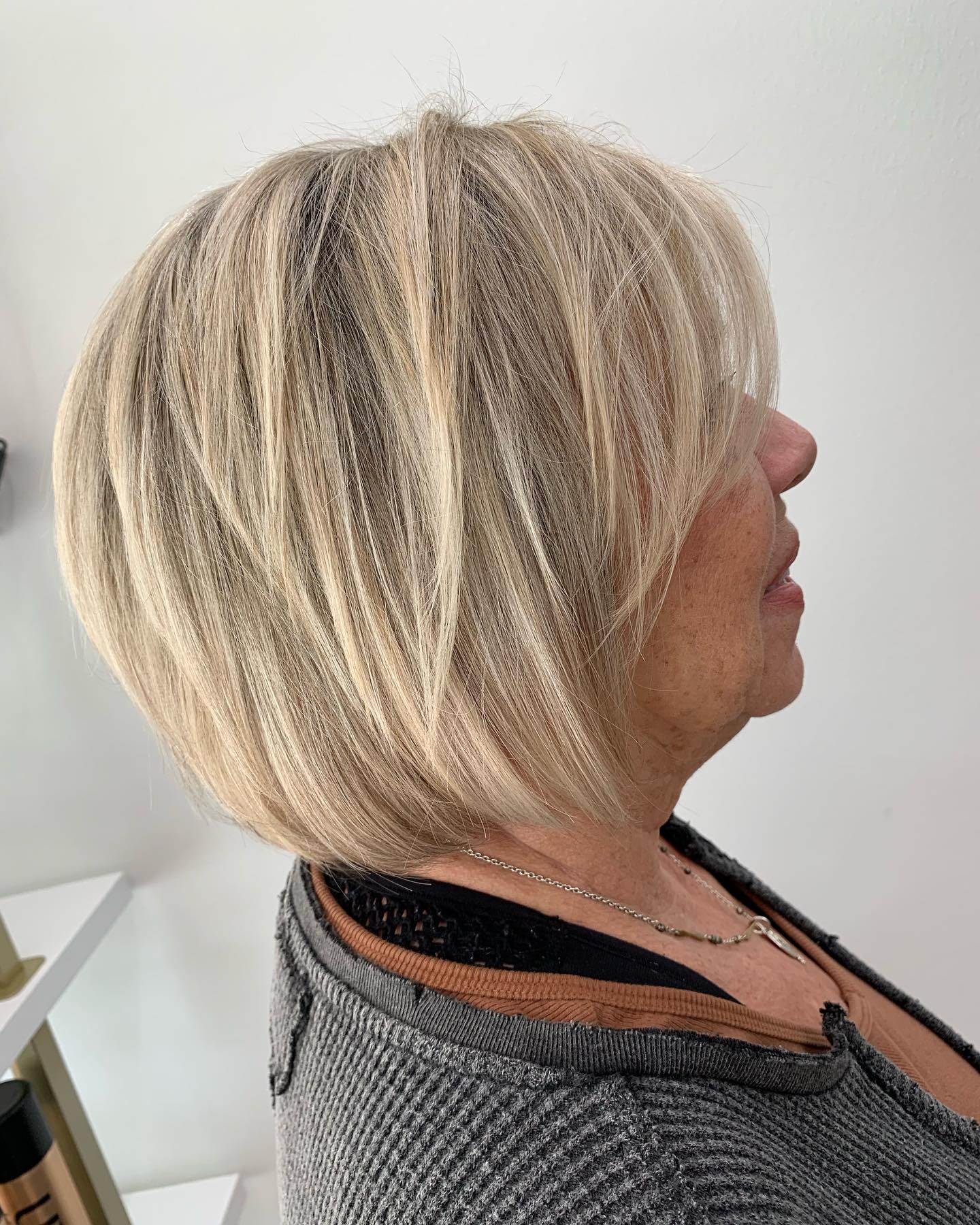 Layers are a surefire way to add an air of youth to any hairstyle. For older ladies, a cropped bob with flowy layers is an ideal option that is easy to manage. For those blonde women out there, add in some highlights for a little extra dimension.