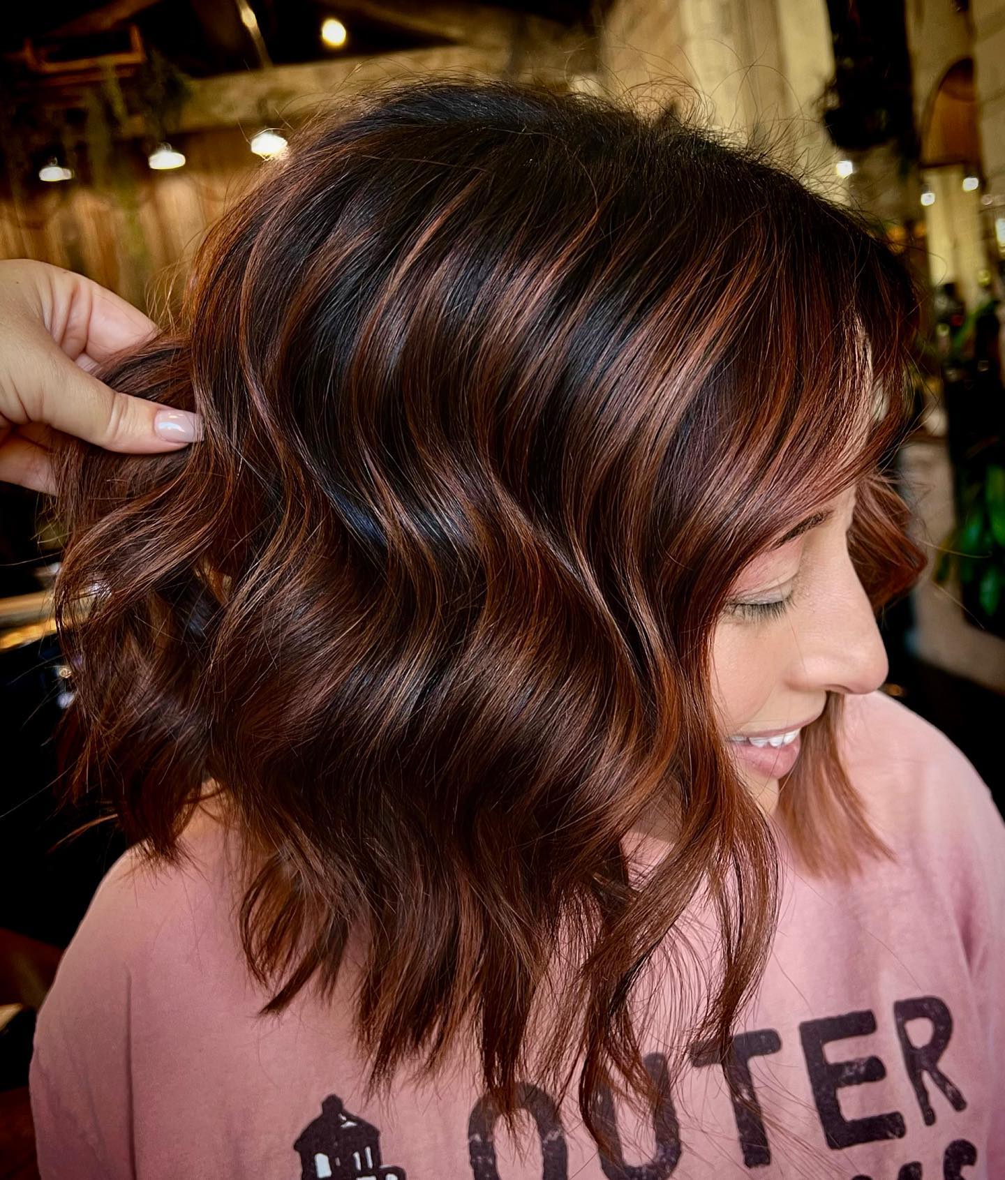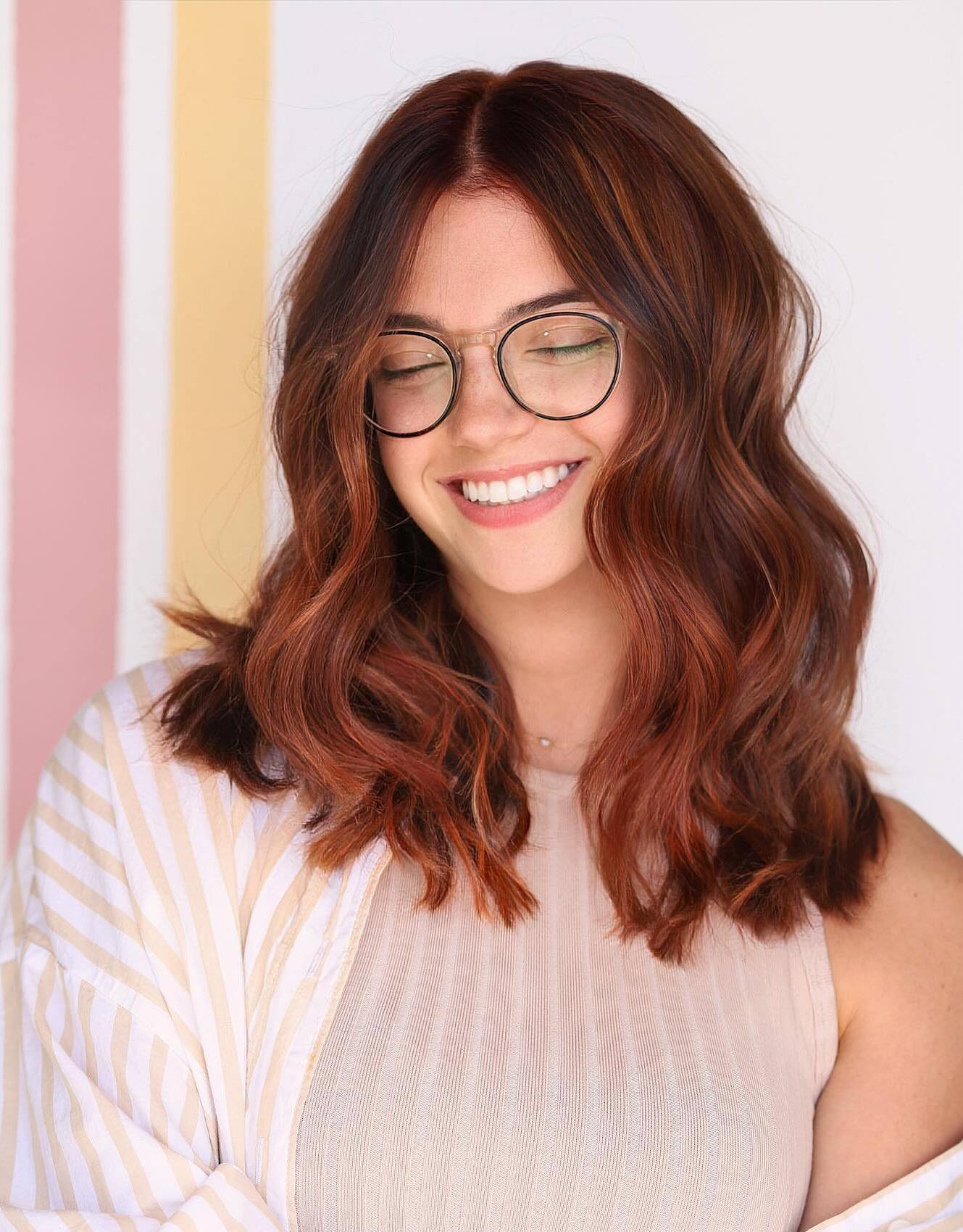 Natural auburn tones always shine best with warm copper highlights, just like in this case. Add soft highlights to give your wavy locks a more textured sassy feel and make your hair look fuller.