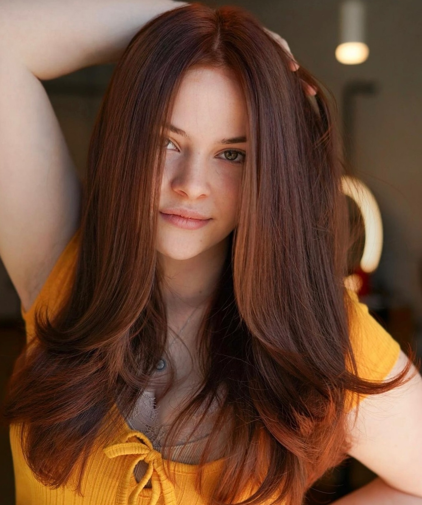A perfectly chosen red hair color will add 1000 points to your karma. And to your natural beauty. To create a reserved business look make a center part and keep your strands straight.