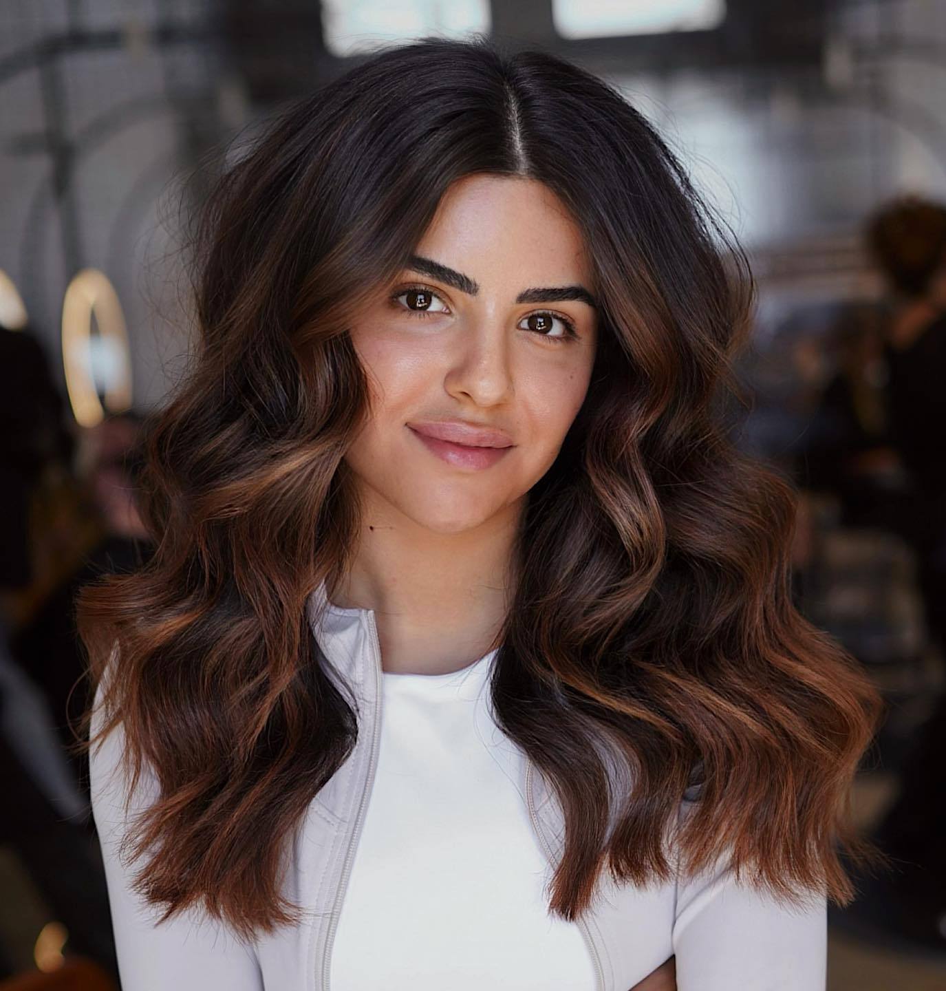 Waves and highlights are undoubtedly a perfect match! Play a little with your natural brown shades by highlighting them with reddish auburn to freshen up your style. If your tresses aren’t naturally wavy, curl them up, creating charming beach waves.