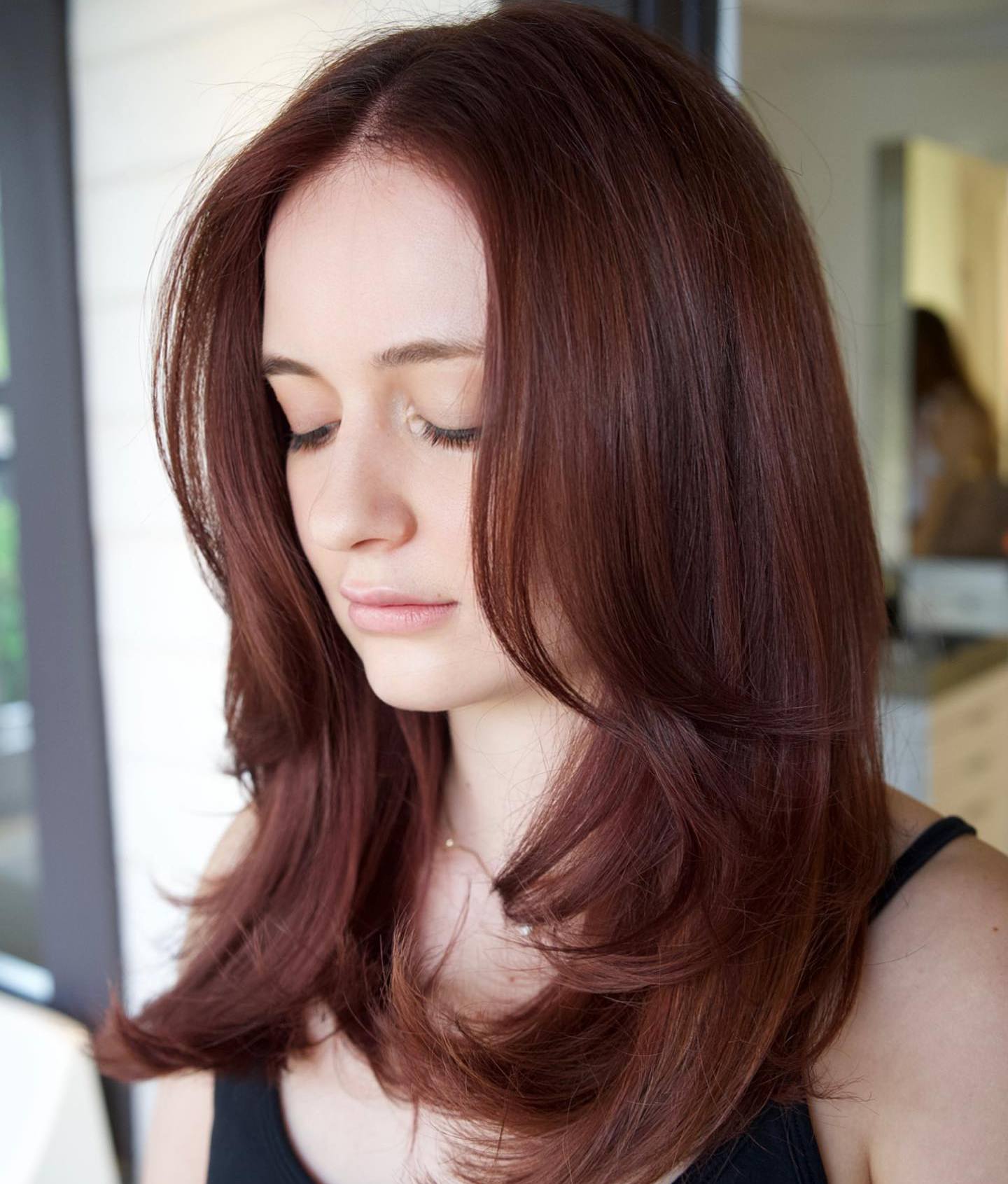 If you want to experiment with color, get only the ends of your layers grazed with the chosen hue and add some long highlights. This lush auburn red shade looks particularly good against natural brown hair.