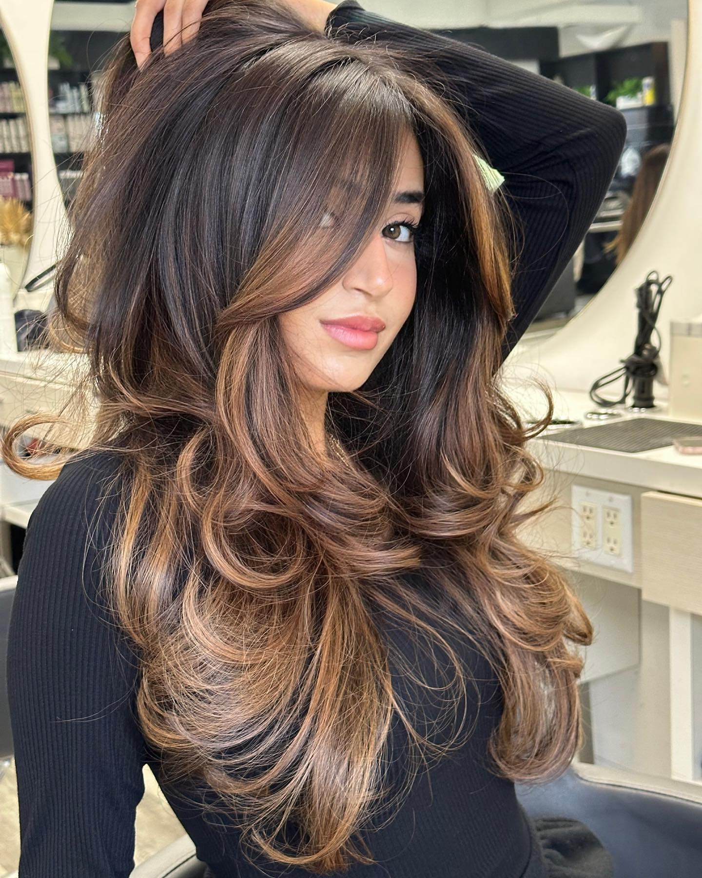 Properly done, balayage on black hair adds subtle depth and texture without breaking up the base too much. Think dark chocolate, espresso, or cool chestnut peeking through for a moody glow.