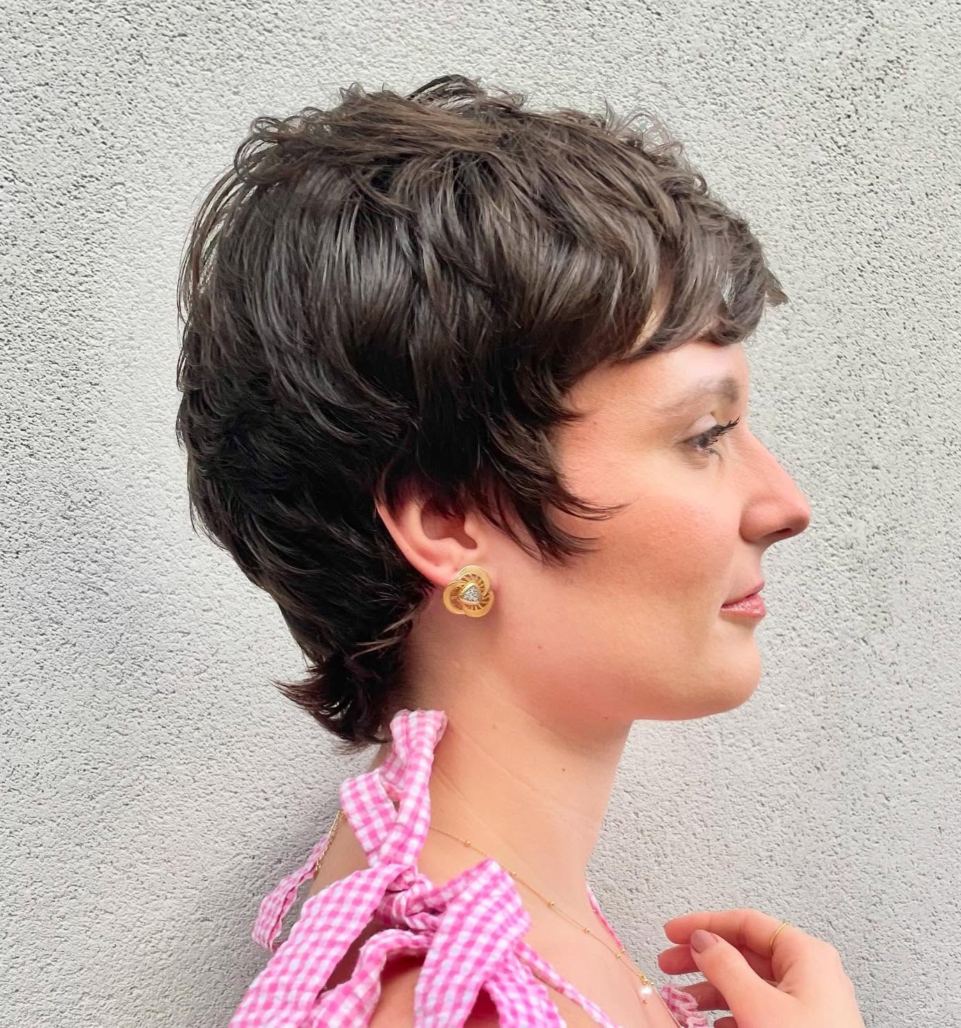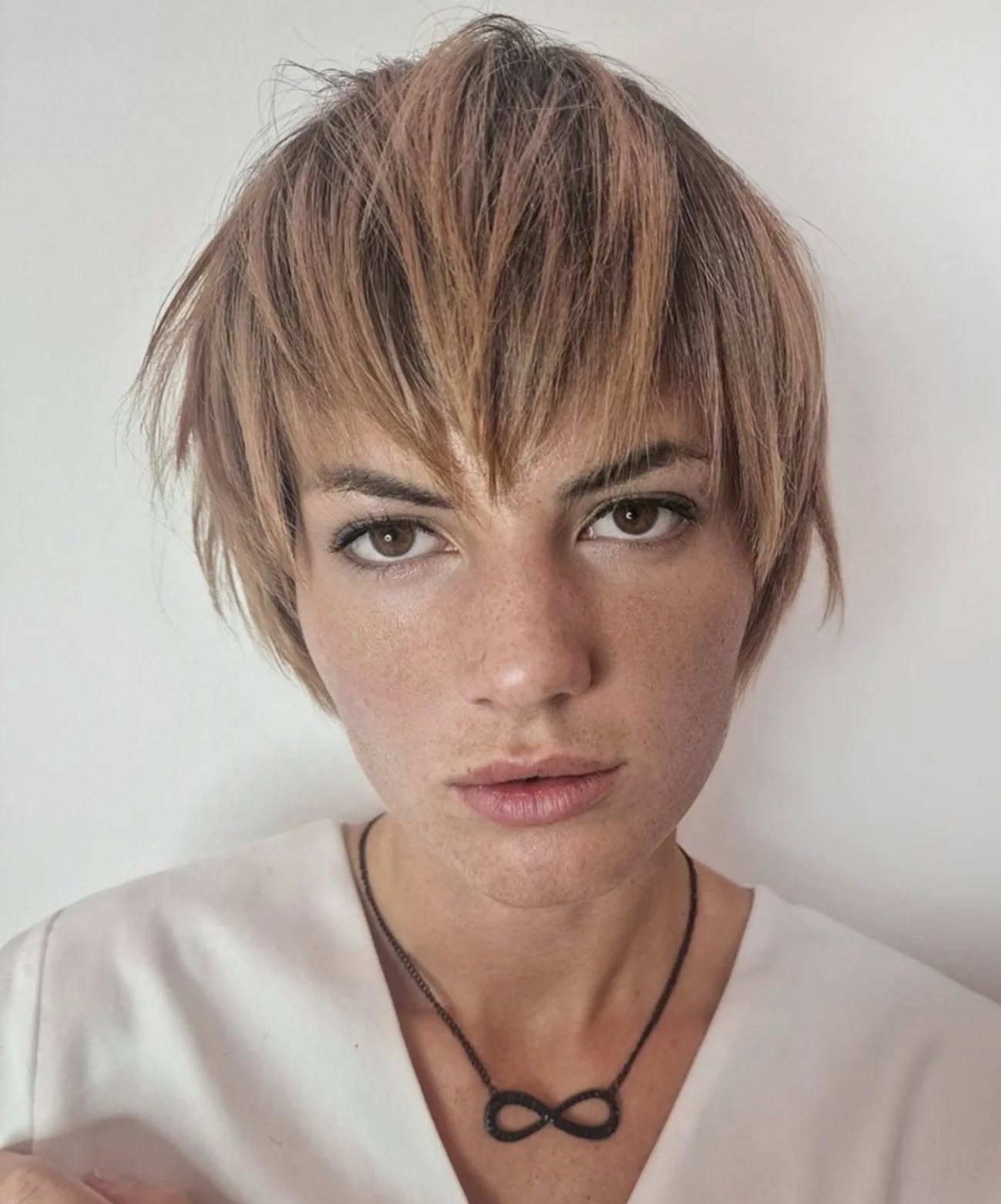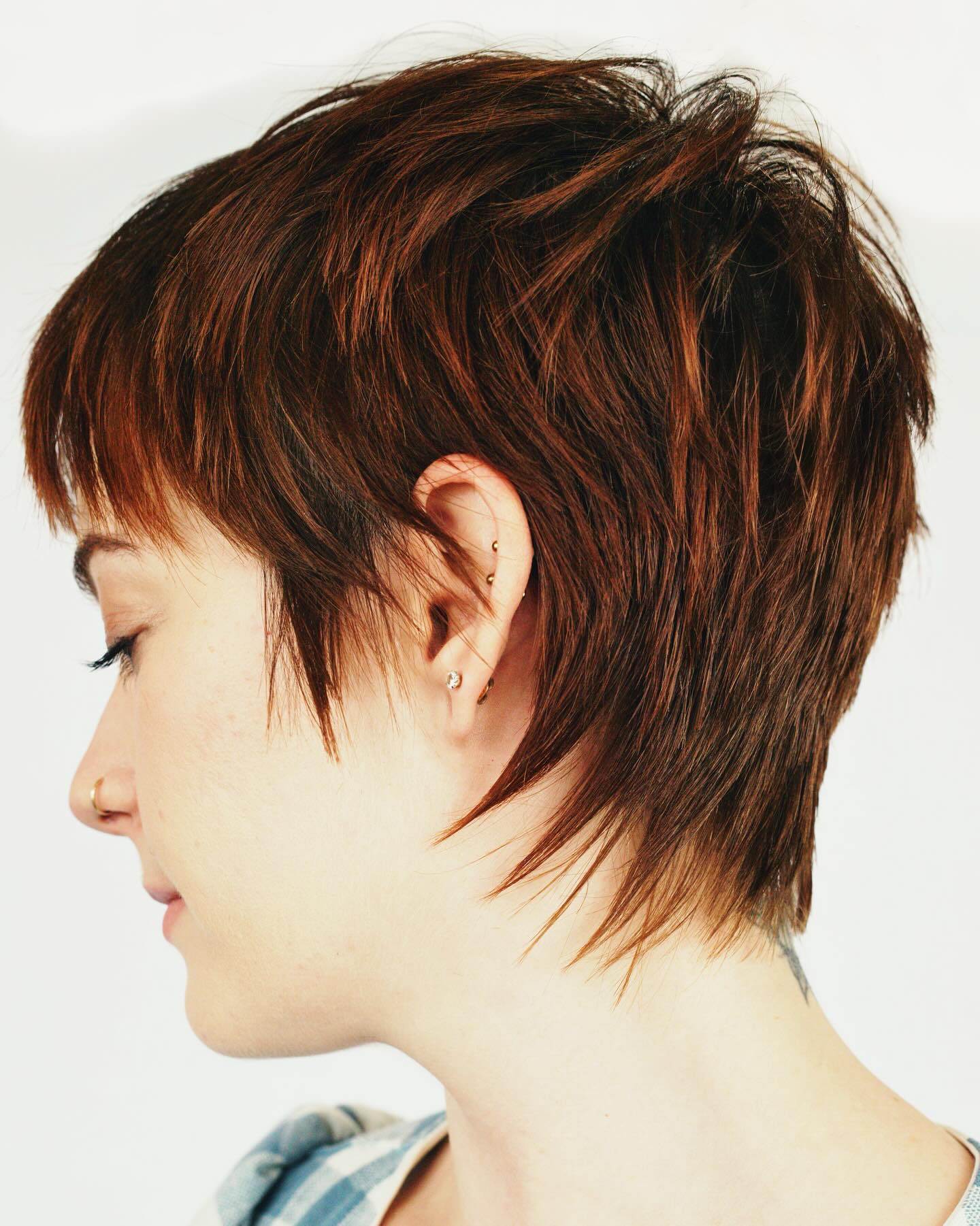 Short choppy hair doesn’t always have to look tomboyish, but it can if you want. If that’s the vibe you’re going for, be sure to keep the bangs extra short and the top extra choppy. Add v-shaped sideburns and an undercut for a more striking effect.