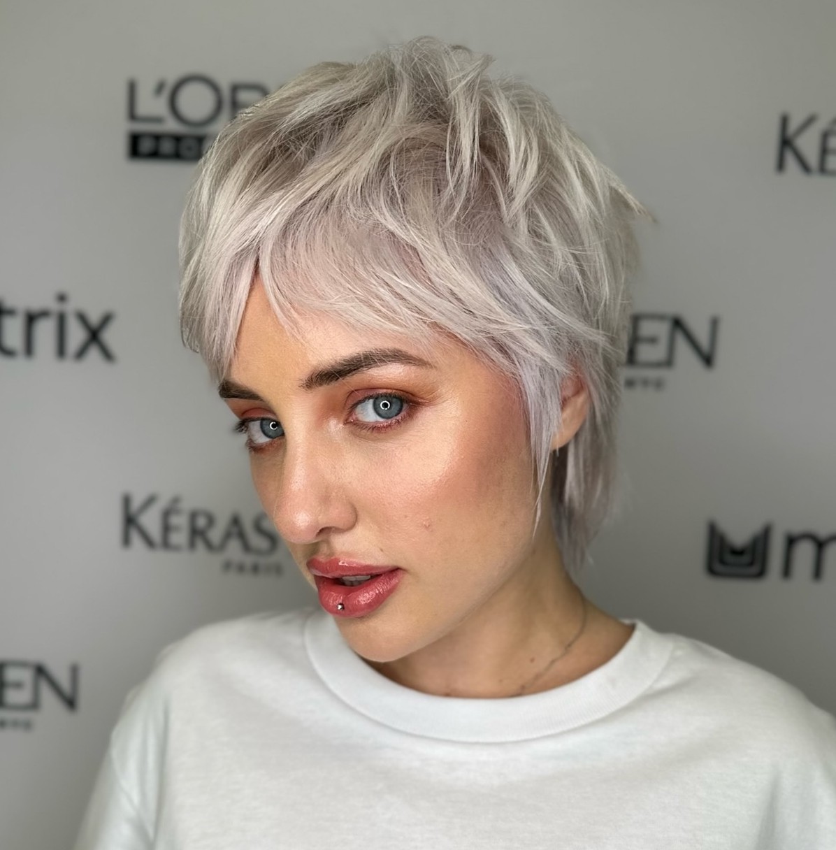 Silver-blonde hair is sassy and fun when it’s cut into a short choppy pixie with a long top and side-swept bang. There’s an extra bit of bounce and fullness that adds a feminine edge, and the closely cropped v-shaped nape keeps the haircut sporty and fun.