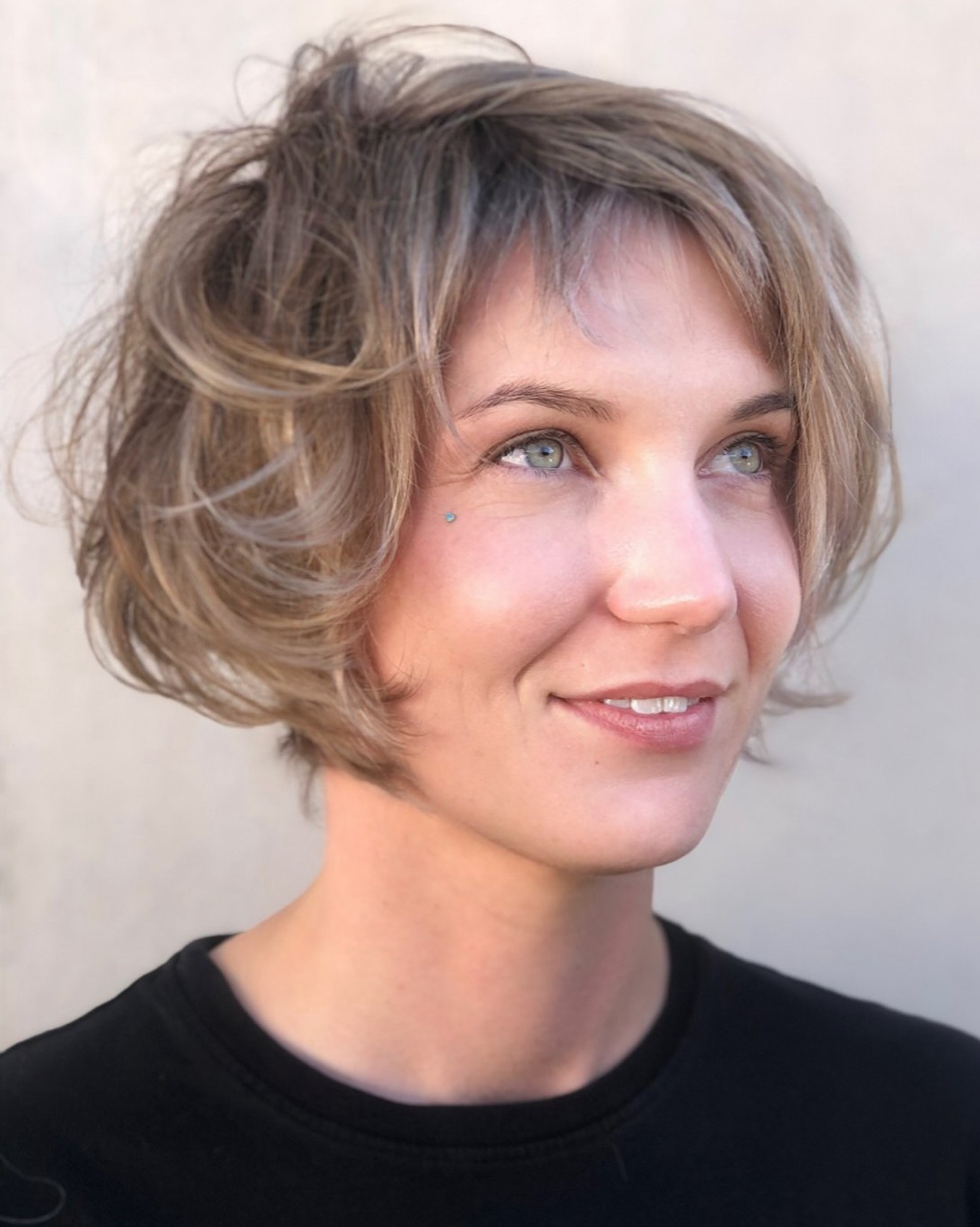When you’re in the market for a new bob hairstyle, consider trying a modern twist on the classic wedge style. The side part and overall round shaping works perfectly with your natural waves, and grazes the jawline, beautifully framing the face. The muted hues of the ash-blonde balayage are timeless.