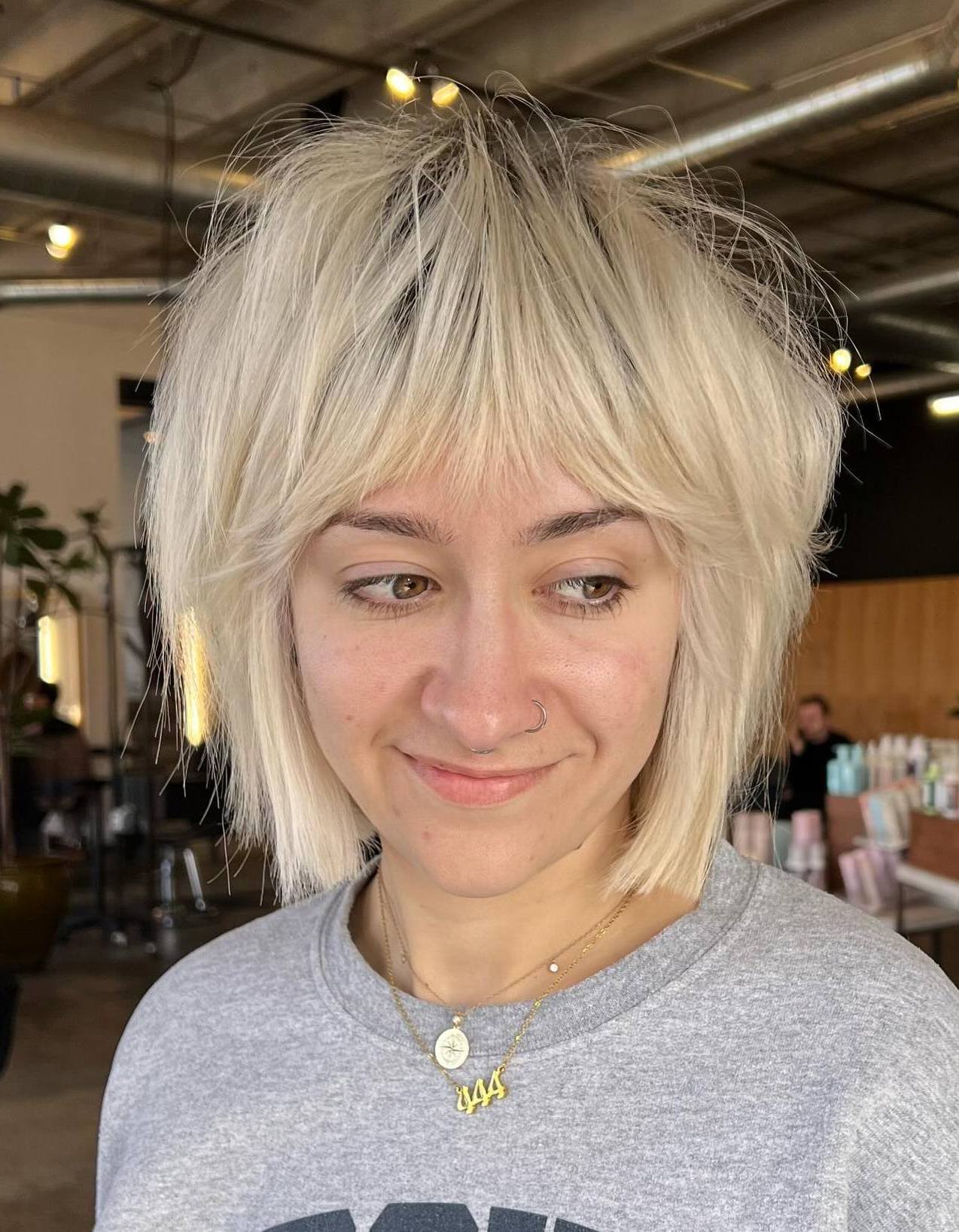 Those not keen on voluminous stacked bobs should try shags. Short textured hair replaces the height at the crown of the head with a uniform jagged length. Incorporating shorter layers achieves the sought-after ragged appearance. Pro tip: Highlighting them with blonde balayage gives extra definition!