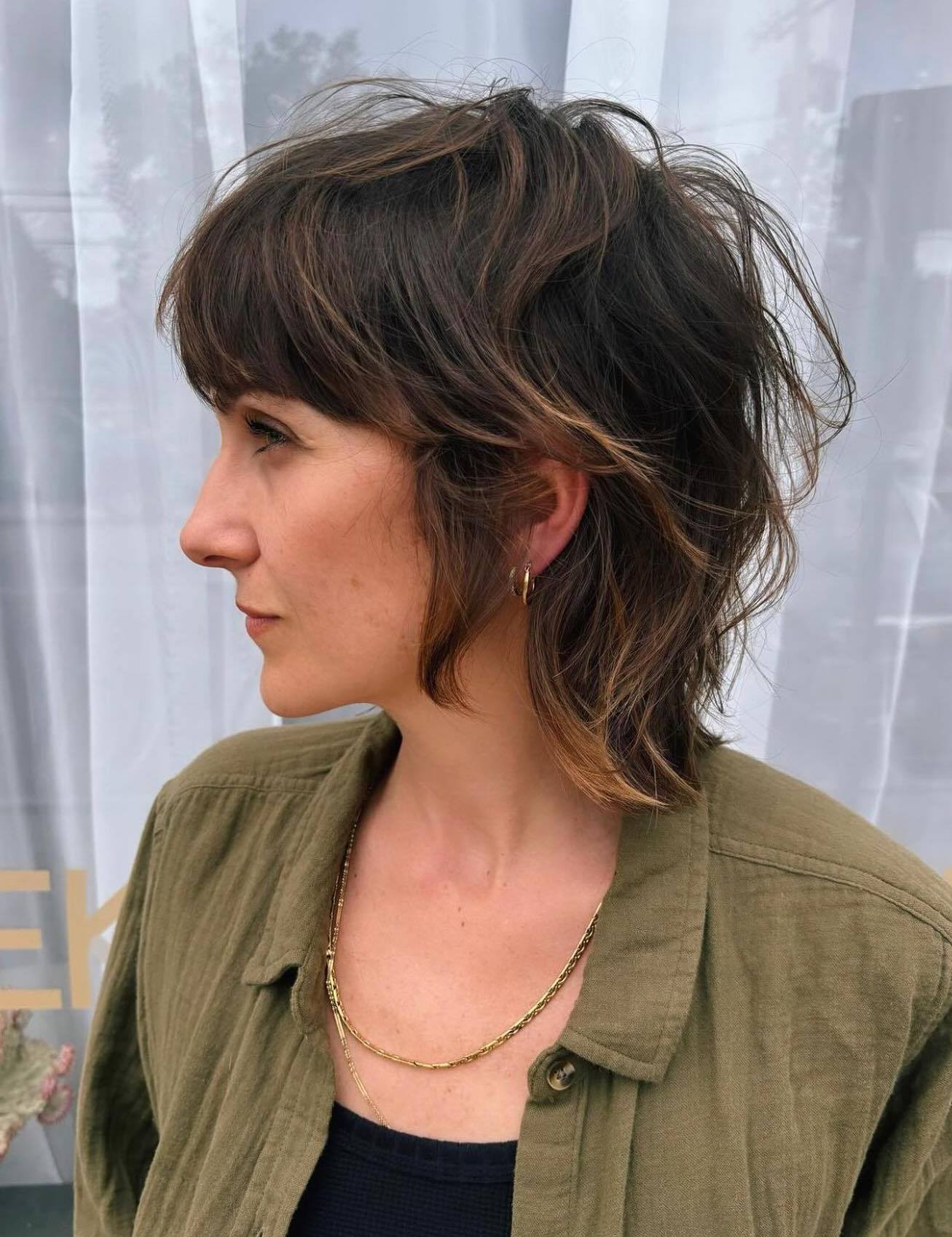 If you have a natural bend to your hair, a shag cut will enhance your texture beautifully. Brown hair with highlights is perfect for this style—the subtle brightness adds dimension and brings out the movement in the layers, creating a soft, effortless look.