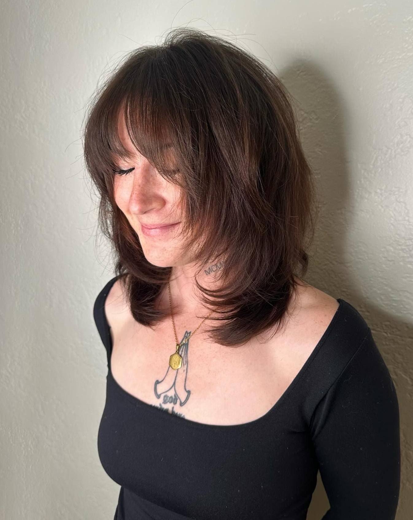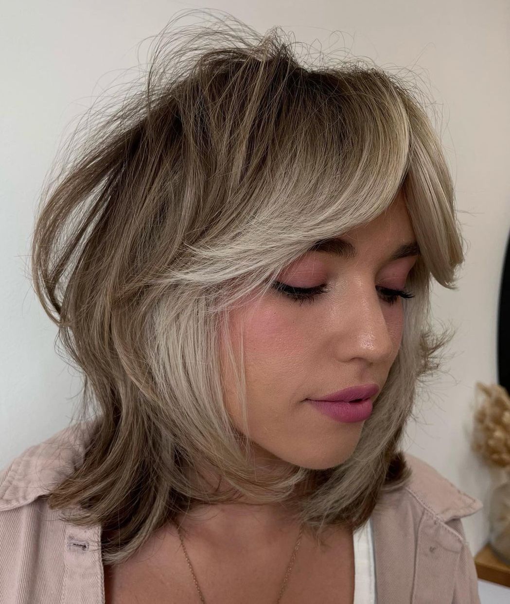 If you prefer a rocker or Harley hairstyle with bangs, look no further than a squared shag with lots of wispy face-framing locks to accent your delicate features. A multitude of sliced layers and tousled crown section give this light-brown shag a notably edgy quality.