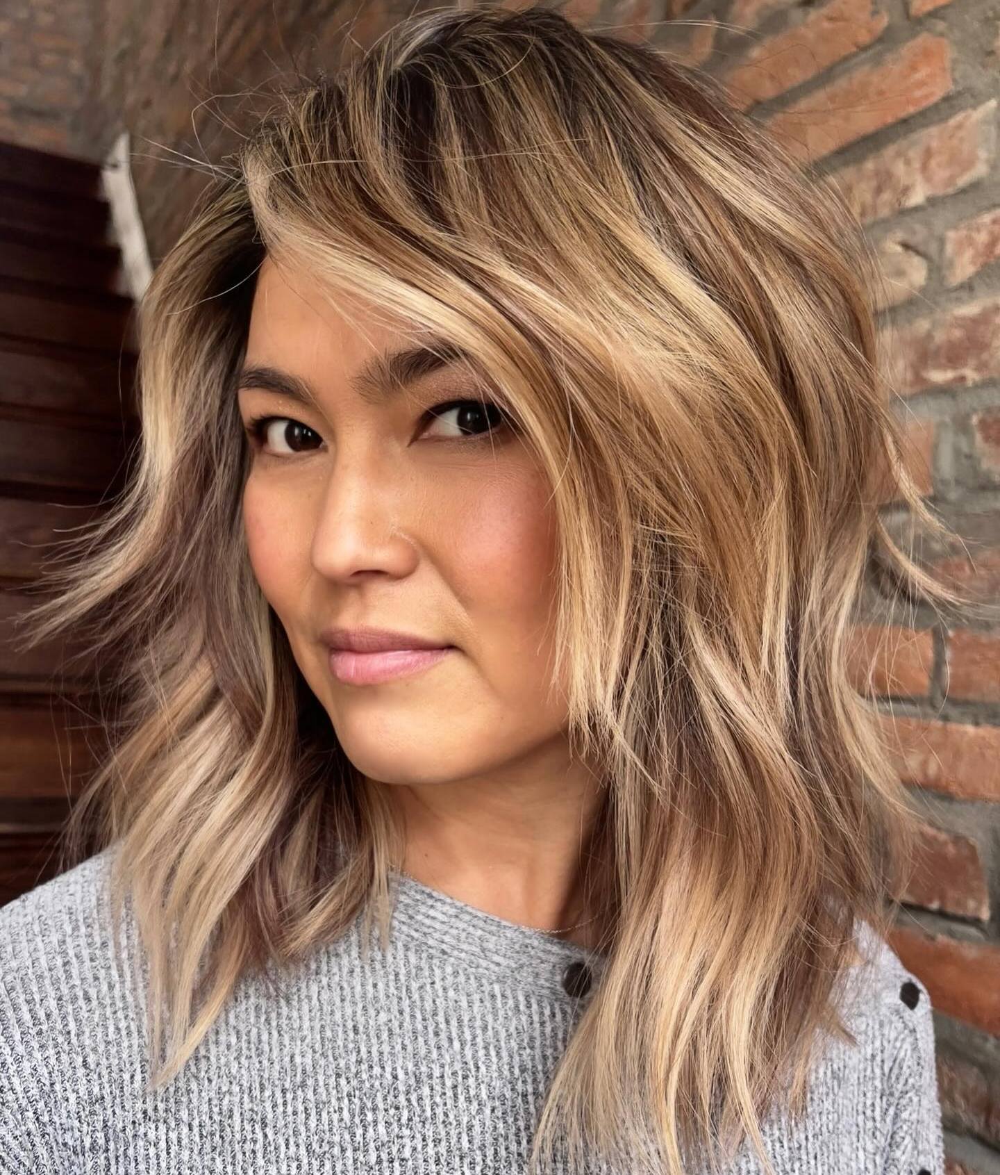 Voluminous V-cut layers come to life in medium shaggy hairstyles. If you simply can’t commit to one hair color, a combination of brown and blonde tones is flattering on almost anyone and can be executed in an endless amount of variations.