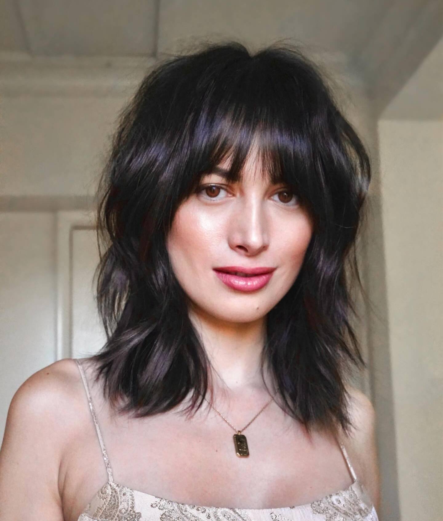 The dark shade, messy styling and eye-glazing wispy bangs contribute to a dynamic shag hairstyle exuding effortless chic. The look is easy to style using a straightener: apply some tension and direct all the strands away from your face.