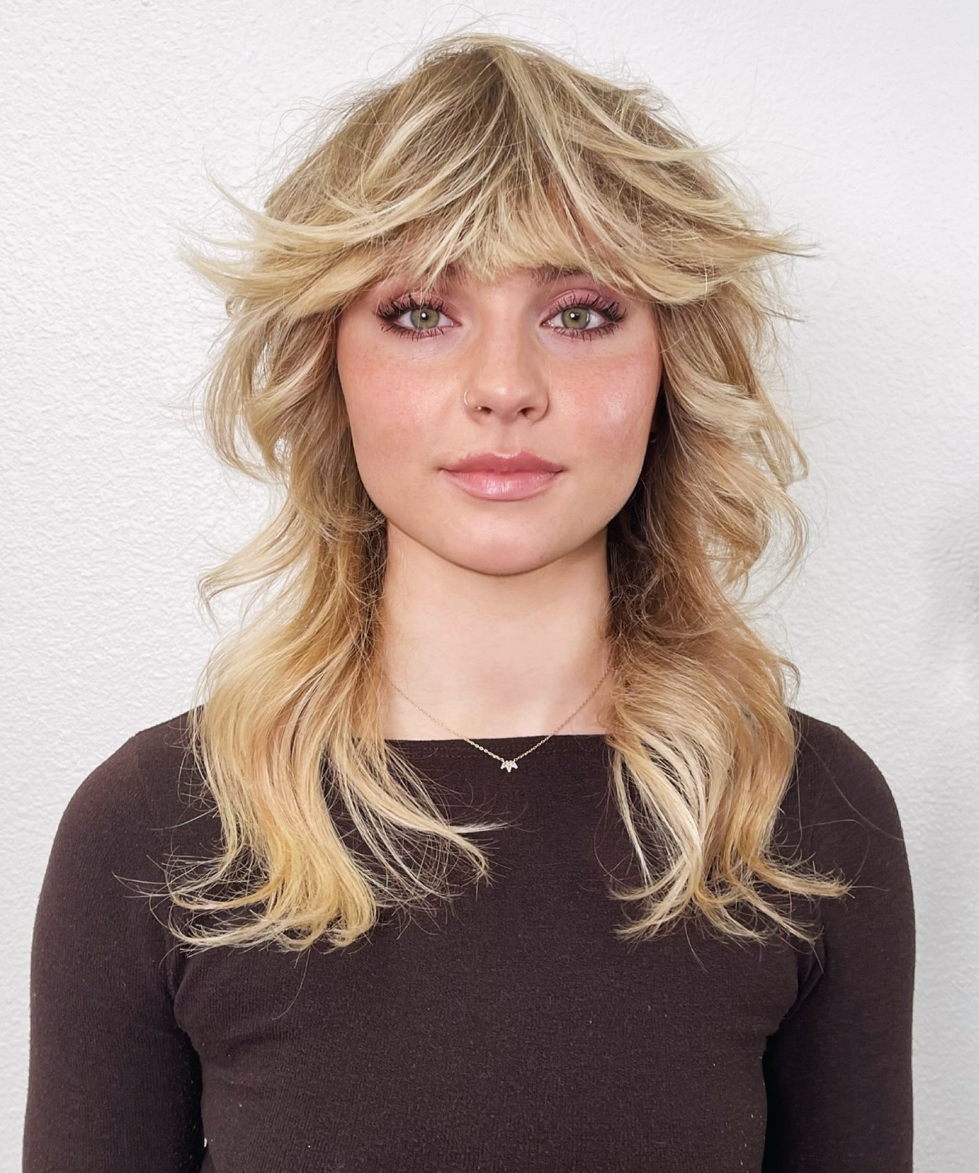 Razored layers with beachy waves are the perfect accessory for every season. This length of bangs gives a peek-a-boo vibe, and they’re still long enough if you want them out of your face.