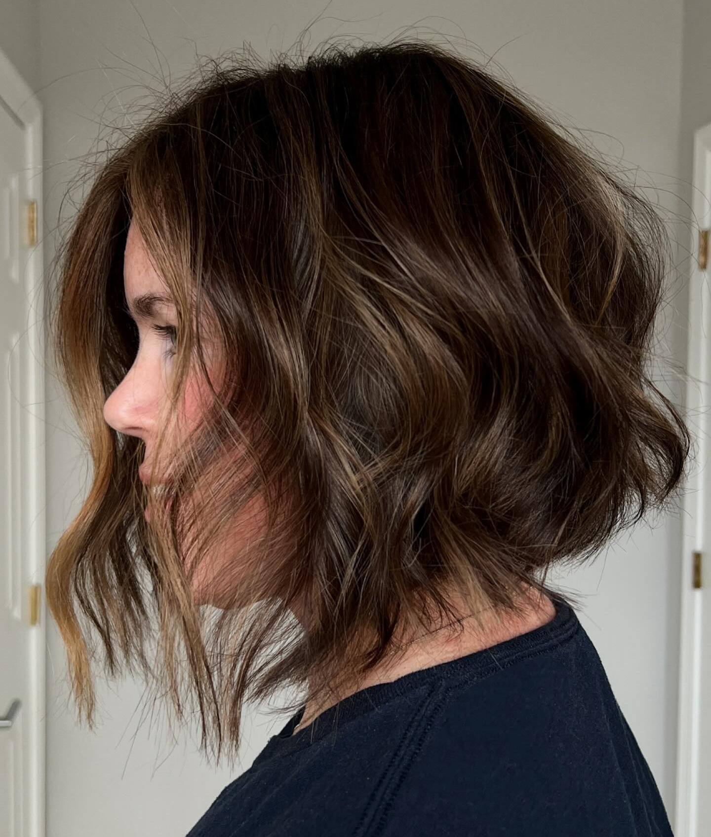 When looking for an eye-catching textured haircut, consider a slightly angled shape that enhances your naturally wavy hair and shiny highlights to brighten your base color. It’s a nice style for a low-maintenance girl.